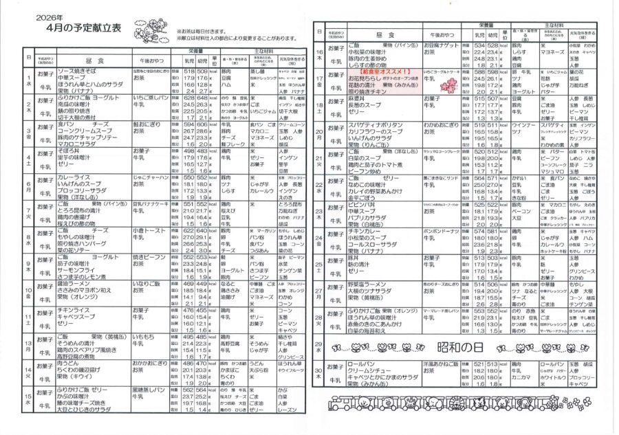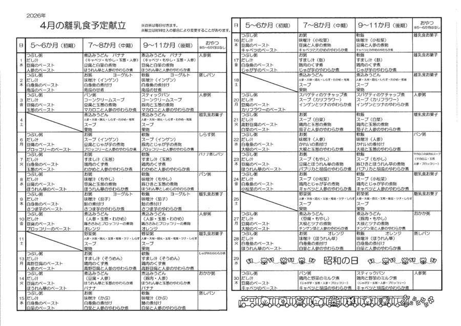 保育園2026年4月の献立